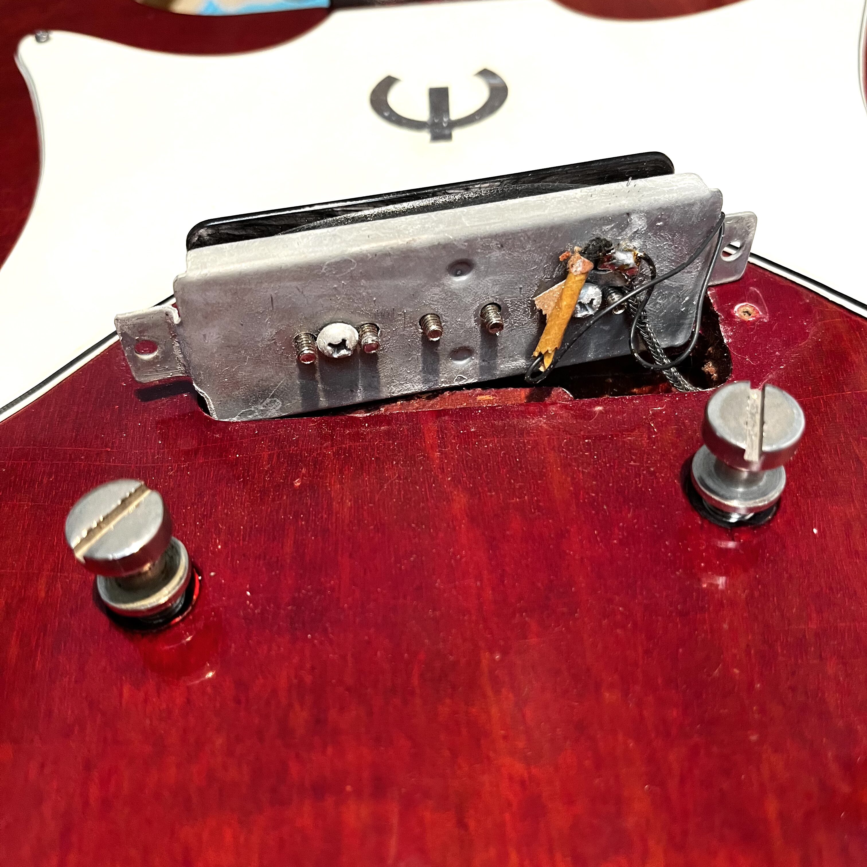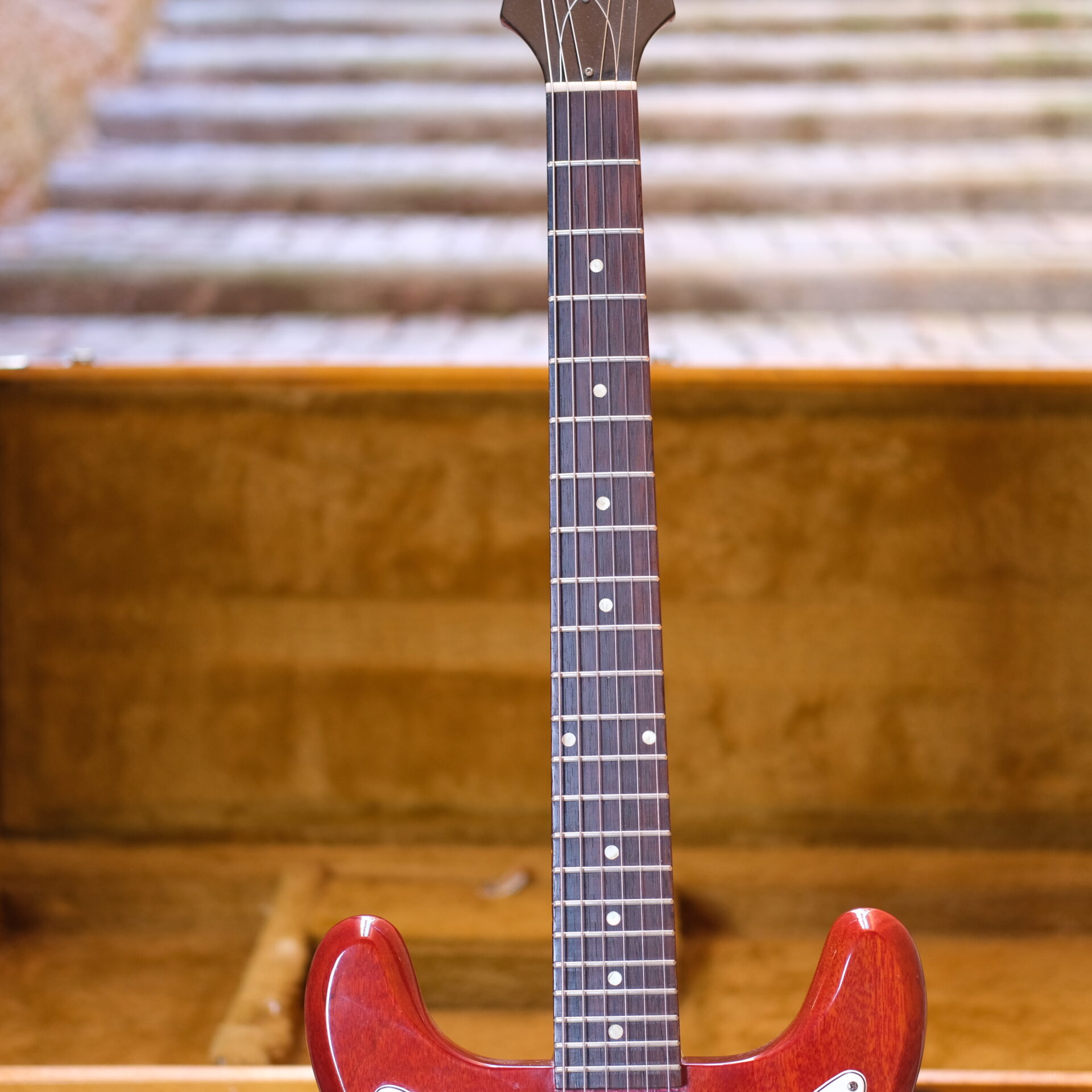 Epiphone’s version of the Gibson Junior, featuring a thinner, solid mahogany body & “dog-eared” P-90 single coil bridge pickup.. This example has been well taken care of, the classic Cherry Red nitrocellulose lacquer, a deep, transparent red that shows off the mahogany grain is beautiful. As the earlier iteration of the model, before several changes arrived in 1963, this guitar retains the symmetrical body shape and Gibson-style peghead. The neck is extremely comfortable in the hand, and the frets are in incredible shape. This powerful P90 gives you that classic, hot tone and screams through a turned-up amp. All electronics are original & in perfect working condition.