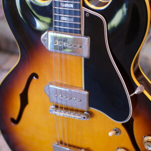 A beautiful vintage Gibson Electric Spanish 330 TD model in excellent clean condition. Full hollow maple body with laminated maple top, no center block. Medium C-shaped 1-piece mahogany neck with a beautiful dark rosewood fretboard, carrying nine gorgeous abalone block inlays, all frets are in excellent condition. The 1 11/16” nut width makes it more desirable to players. The headstock face is clean with just some barely visible cosmetic wear on it, carrying the pristine pearl inlayed “Gibson” logo. The serial number is clearly visible at the back side. The 6 single-line Kluson Deluxe tuners w/oval white buttons are straight and work all smooth. The dual P-90 pickups are sounding fantastic, warm and dynamic. The nickel “dog-ear” covers and trapeze tailpiece give extra elegance and charm to this guitar. The 3-tone sunburst on the body top, the dark brown back and sides, all has kept its full color and the shiny glossy nitro-finish with no checking and no wear accentuates the grain pattern of the maple wood, very nice. The cream-colored binding looks amazing. The 3-ply black pickguard is straight and complete. The nickel “dog-ear” pickup covers do show soft natural aging. All electronics and soldering remain original and untouched. No breaks, no cracks, of corse not!