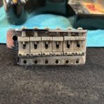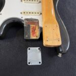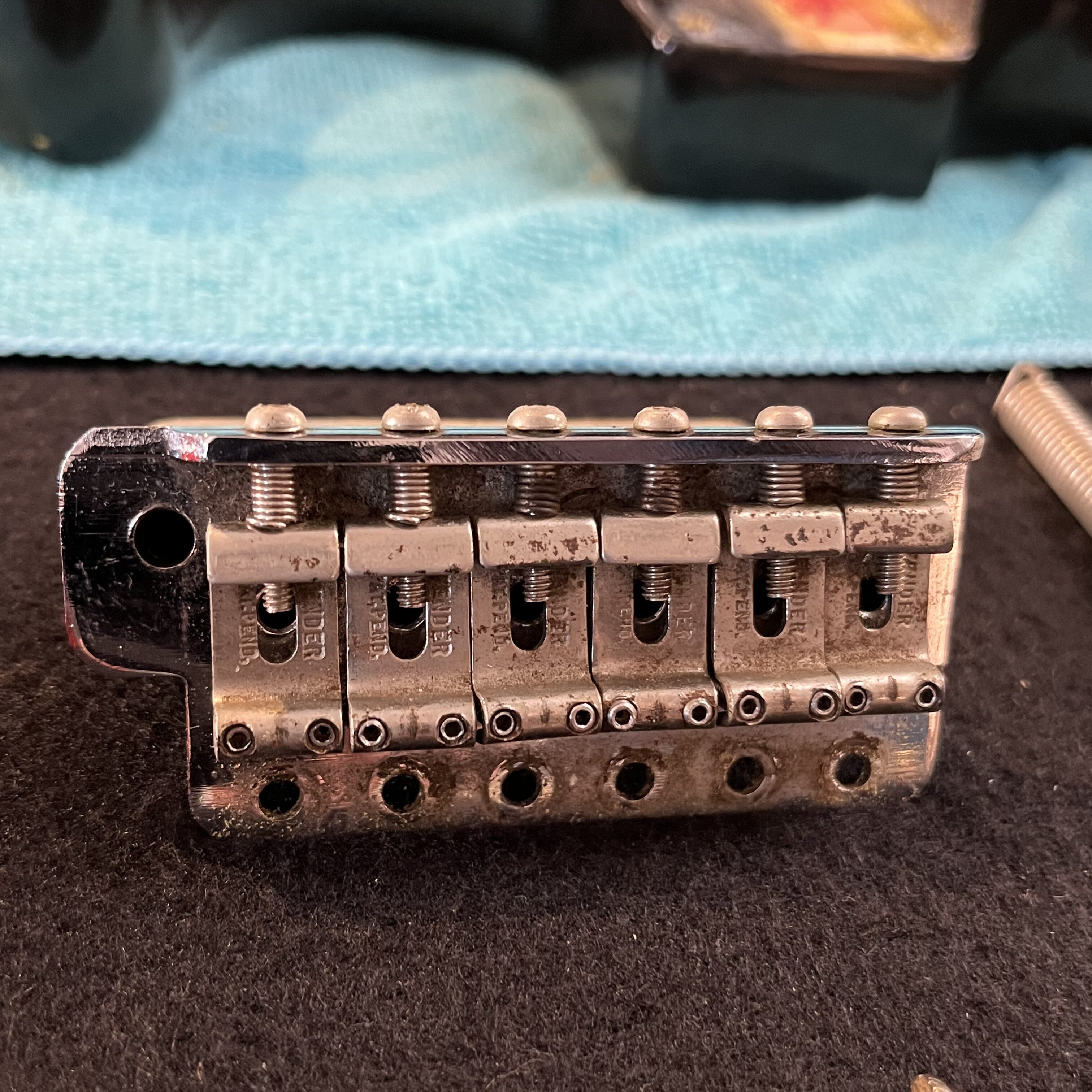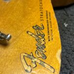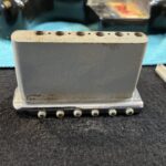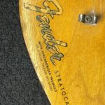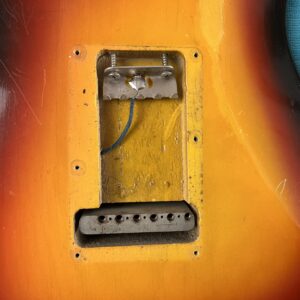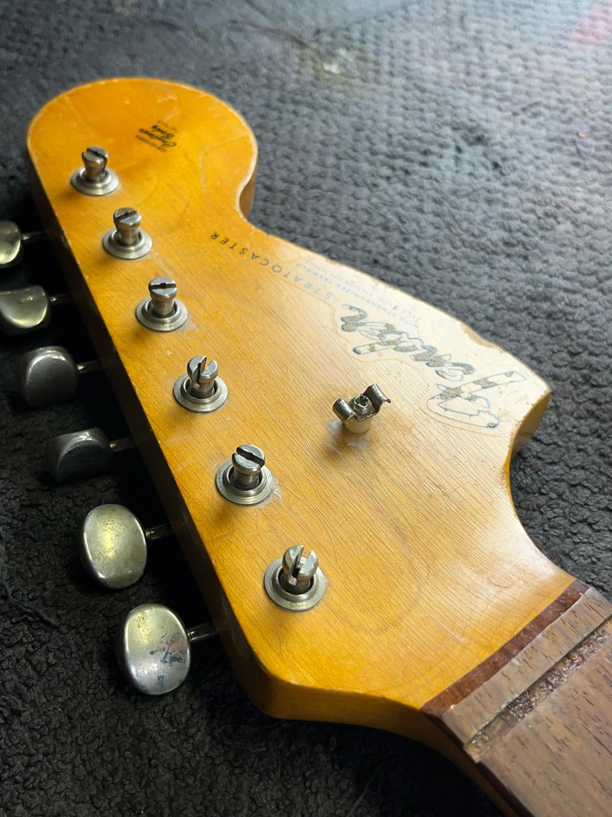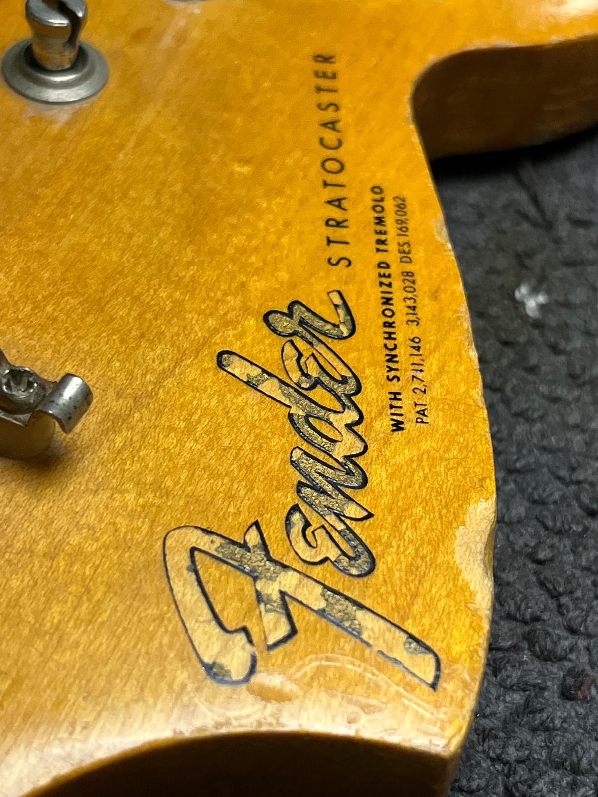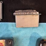 - Fender “synchronized” tremolo w/6x “Pat.nr.stamped” steel-saddles