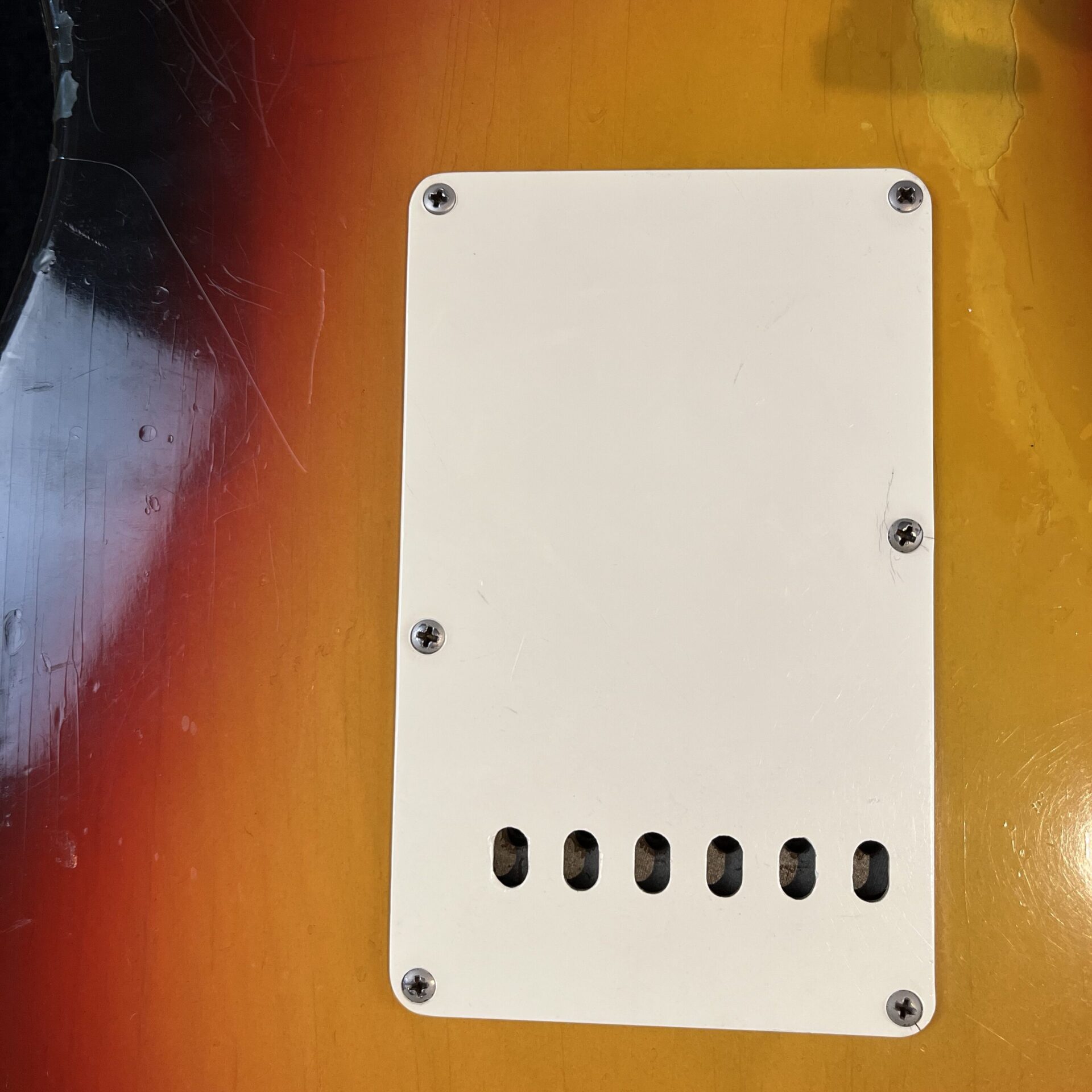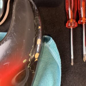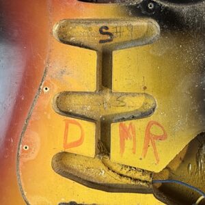 The letters DMR which are hand written in red over the pickup cavity area declares that this guitar got a color + lacquer correction at the lower edge on the backside of the body. Done by a Fender employee at the time, it is factory original. Visible only under blacklight, see pics.