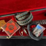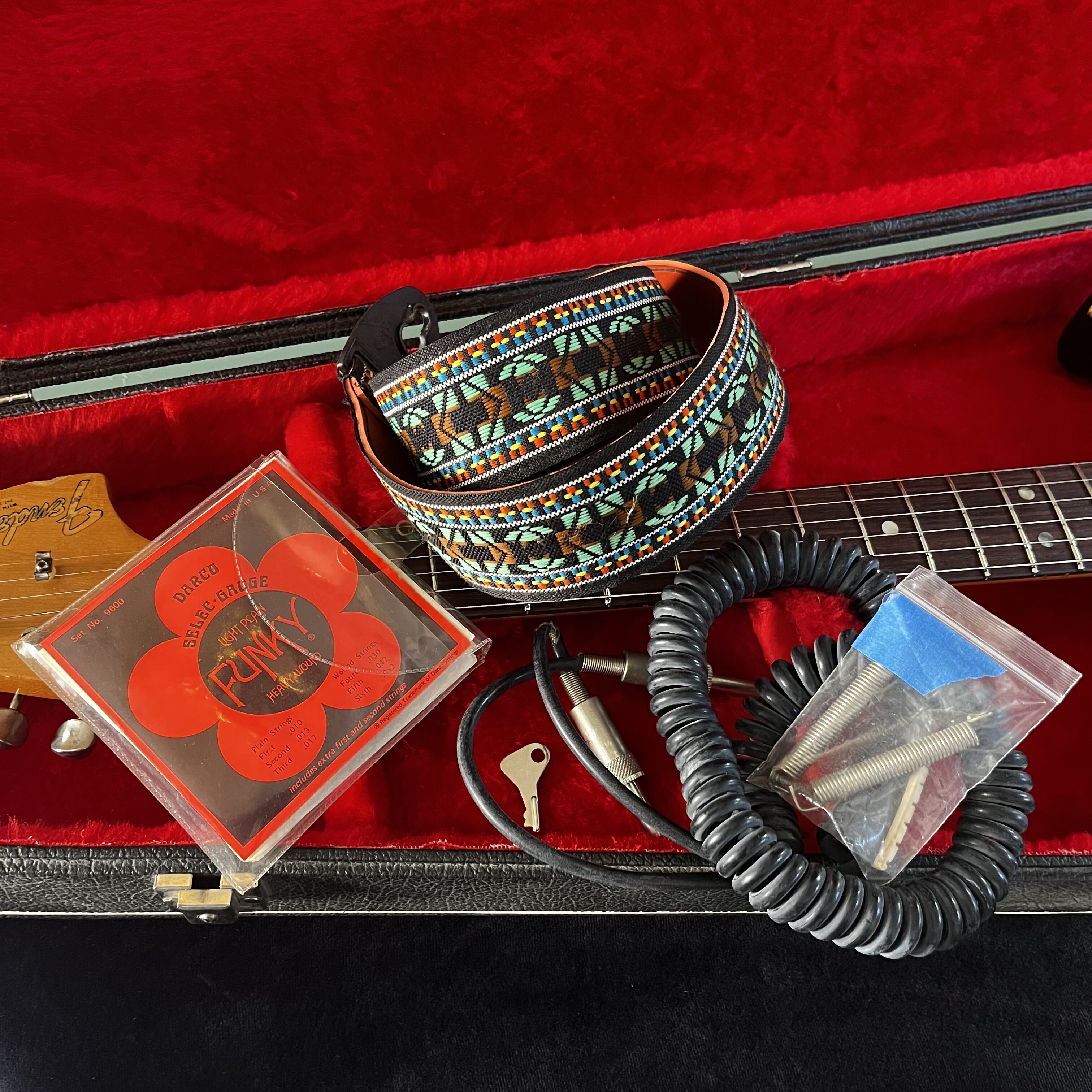 Comes in its original black Polverini hard shell case (one lash is missing) with red interior in very nice condition, and included are; -its key , -a vintage set of Darco Selec-Gauge Light Plain Funky Strings, -a original black coiled vintage cable, -a nice green woven strap (see pics).